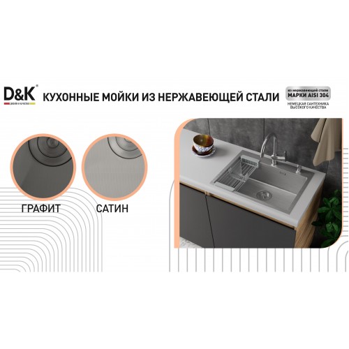 Мойки кухонные D&K сделаны вручную из высококачественной нержавеющей стали AISI 304, обработанной холодом для придания изделию прочности. Мойки идеально выдерживают перепады температуры, практичны и износостойки.